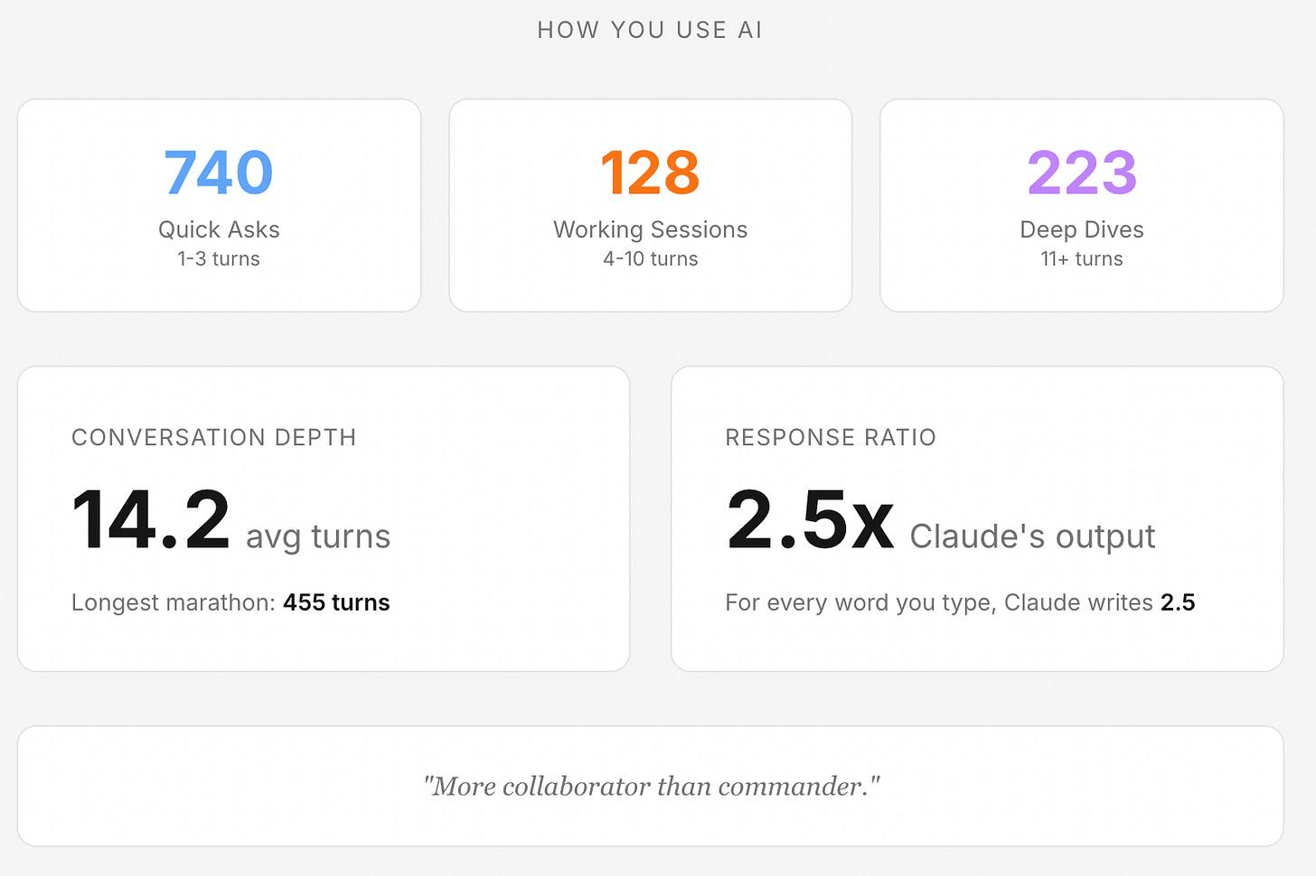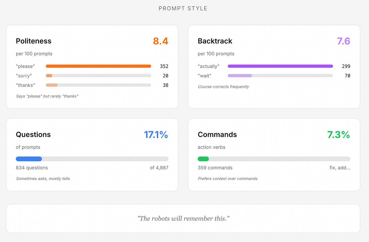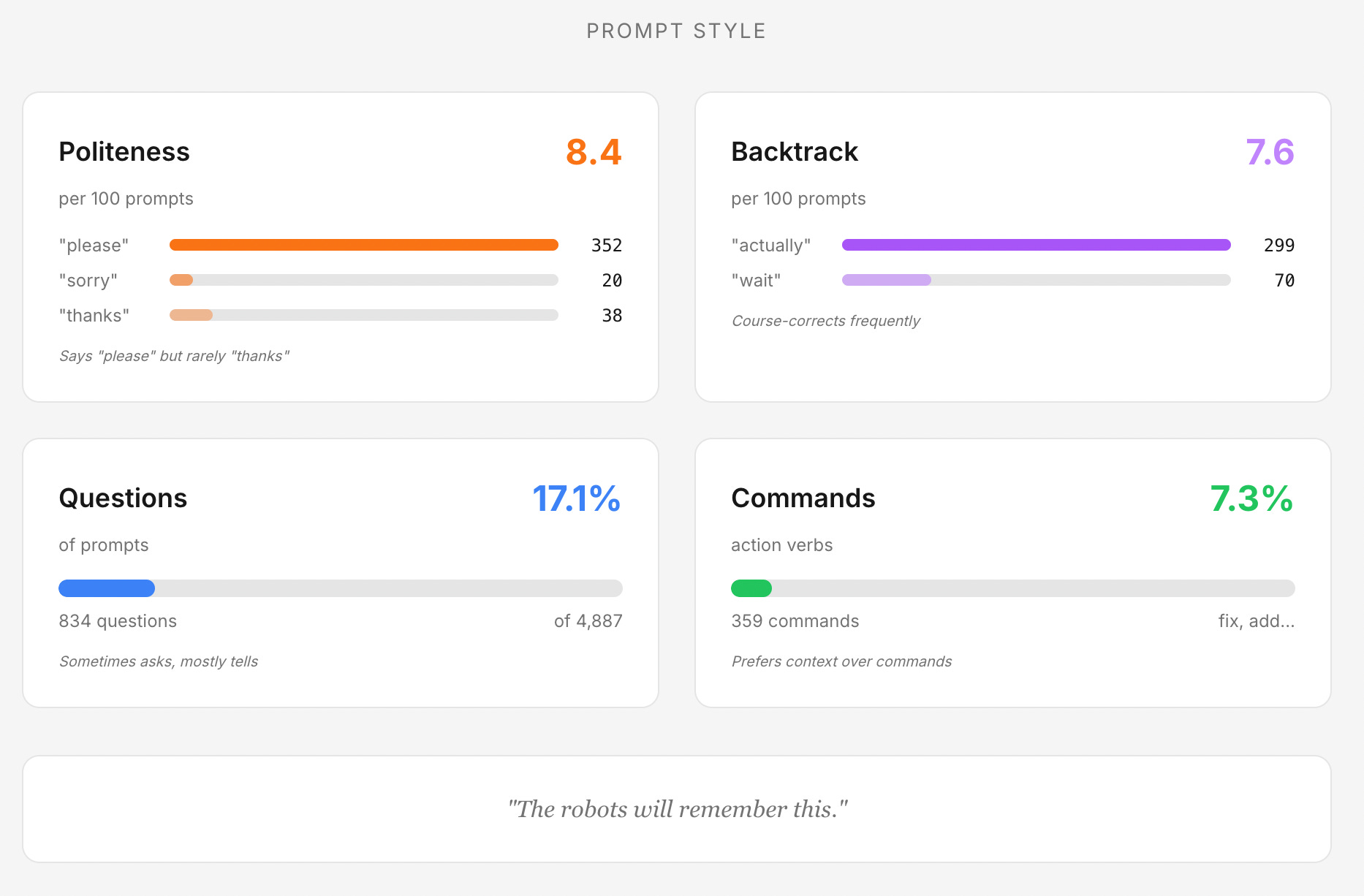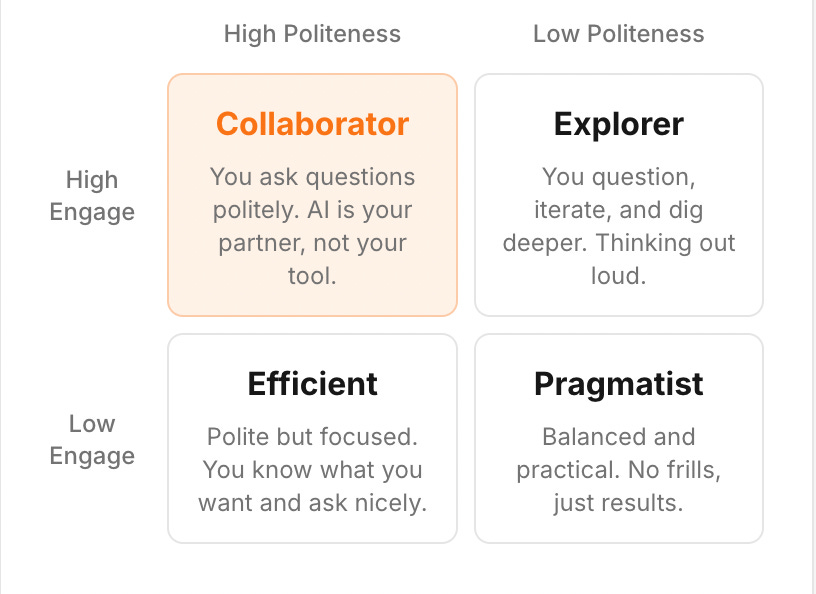 After parsing through 4,887 prompts across Claude Code & Claude.ai, I discovered I’m what my tool classifies as a “Collaborator” - someone who asks questions politely and treats AI as a partner rather than a command-line interface. I hope the future AGI robots remember this!